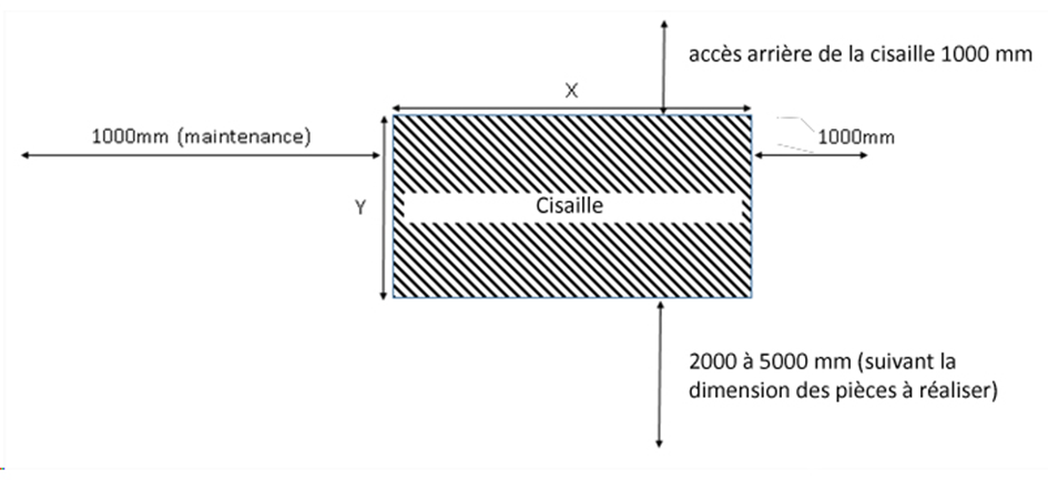 La cisaille est un moyen de production, et il est important de la positionner dans l’atelier en prenant en considération les flux et les accès maintenance. Ci-dessous plan avec les distances préconisées par le constructeur.