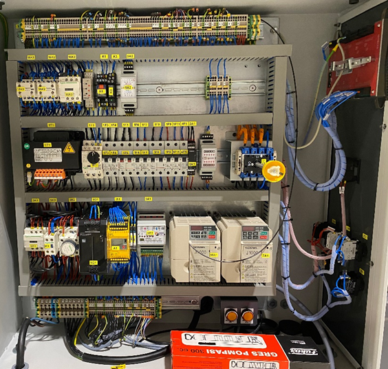 L’armoire électrique se trouve sur la gauche de la cisaille lorsque vous êtes en face de cette dernière. Il faut prévoir un mètre pour ouvrir l’armoire.
